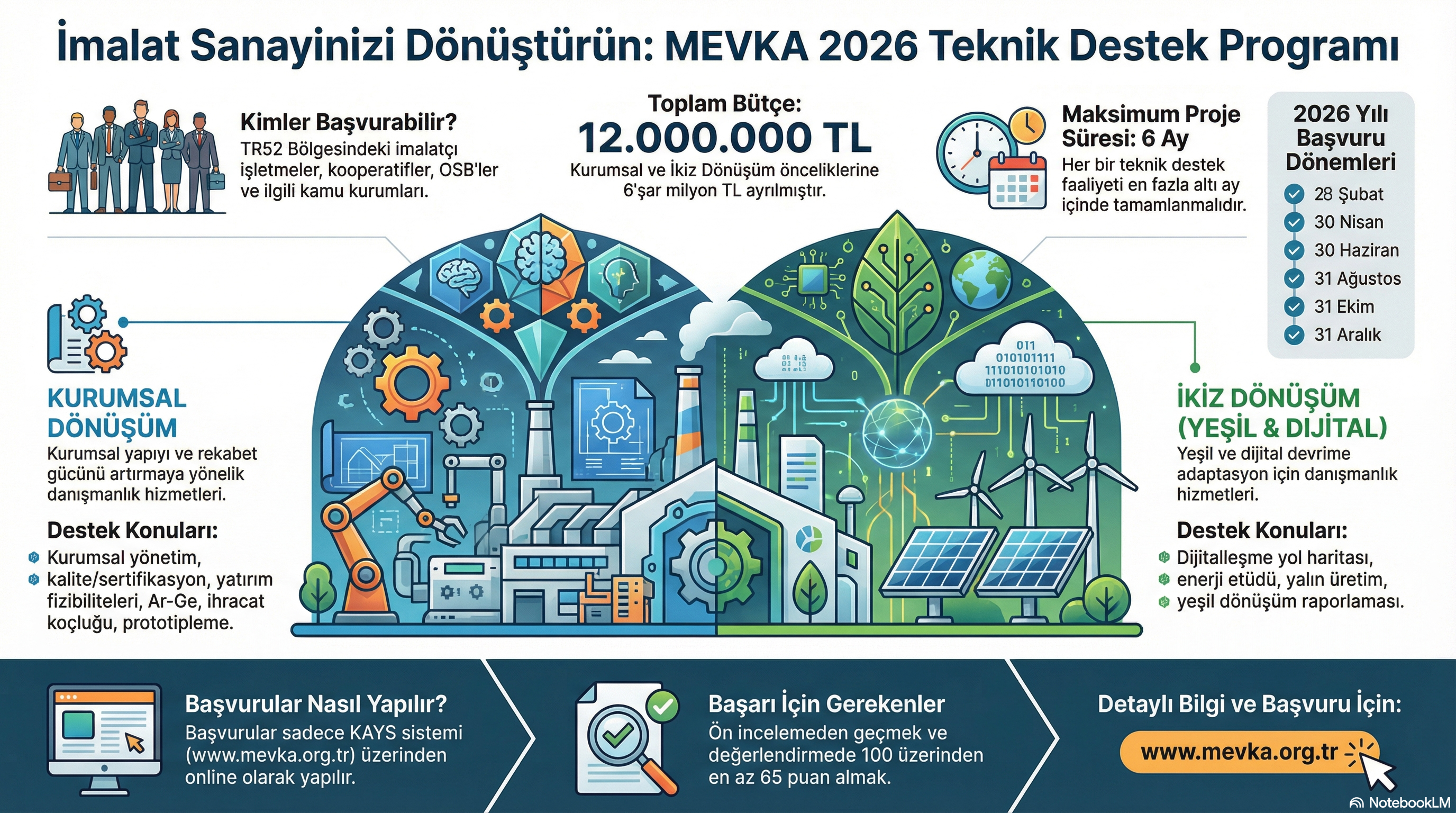 2026 yılı İmalat Sanayinde Dönüşüm Teknik Destek Programı, Mevlana Kalkınma Ajansı TR52 Bölgesi 2024-2028 Bölge Planı, 2024-2026 Sonuç Odaklı Programı, 2026 yılı Çalışma Programı ve Yönetim Kurulunun 30 Ocak 2026 tarih ve 2026/1 numaralı Kararına istinaden ilan edilmiştir.