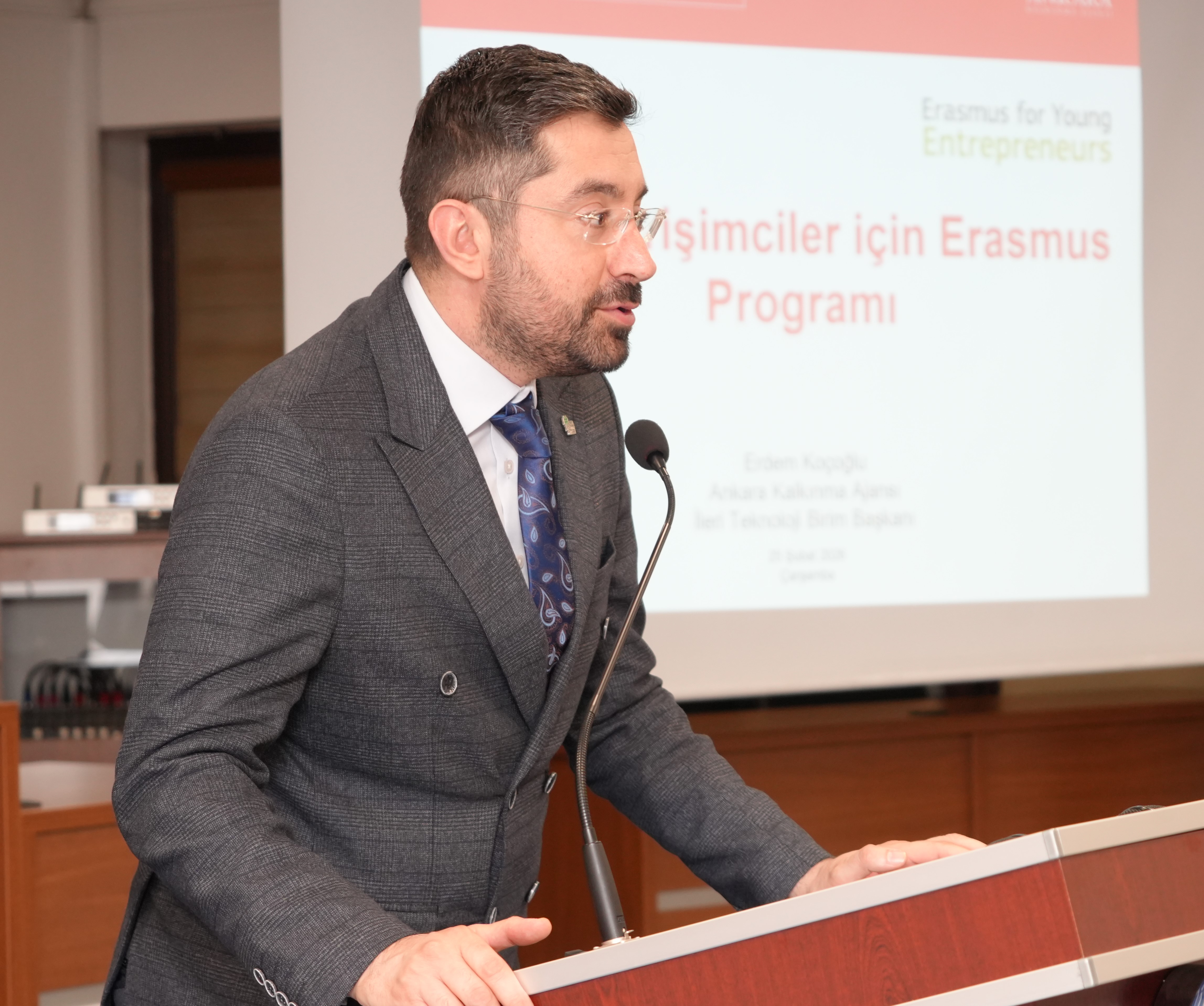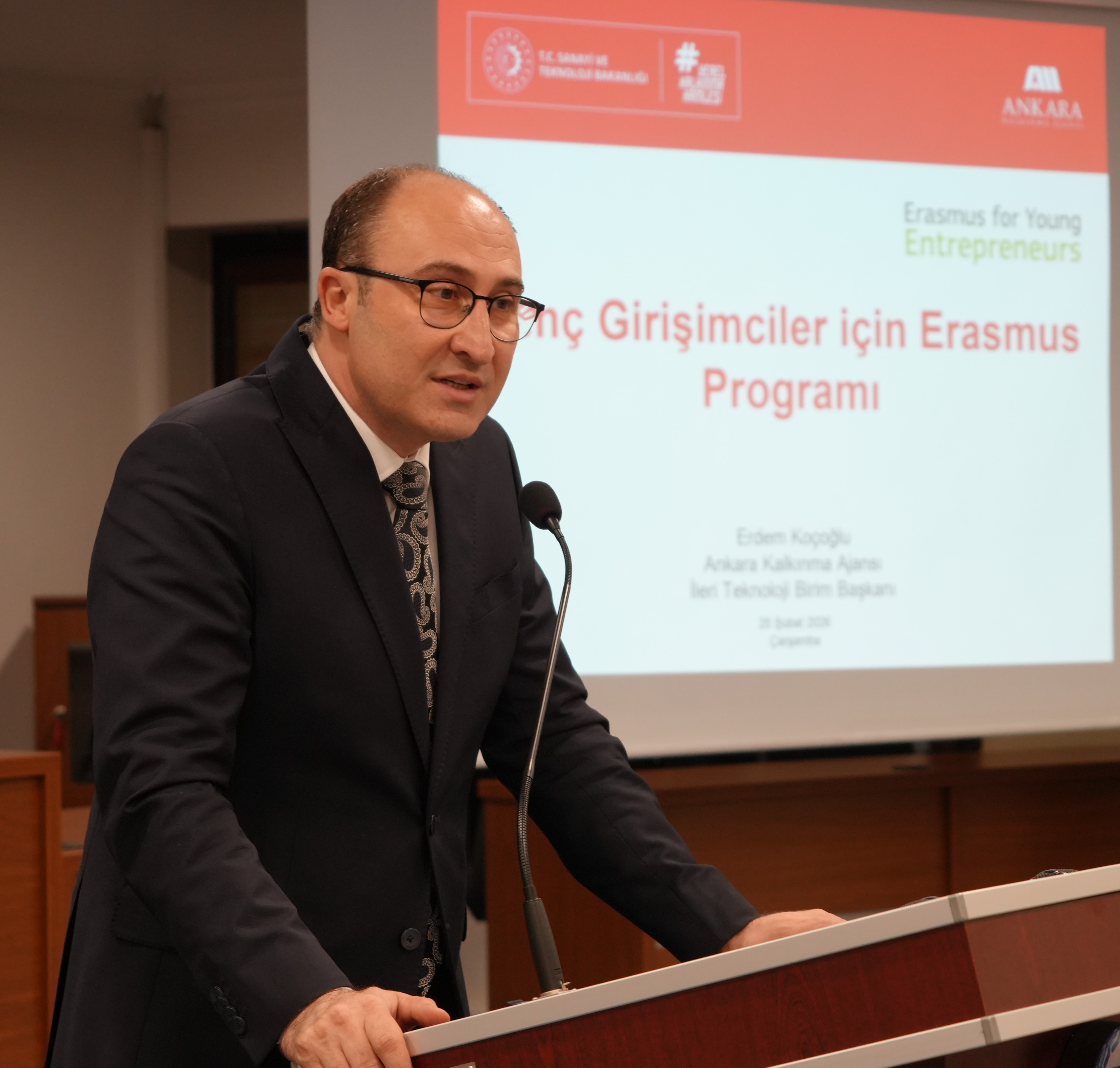 İki bölüm olarak gerçekleştirilen programın ilk bölümünde Ankara Kalkınma Ajansı İleri Teknoloji Birim Başkanı Erdem Koçoğlu, yaptığı sunum eşliğinde katılımcılara Genç Girişimciler İçin Erasmus Hibe Programı hakkında ayrıntılı bilgiler verdi.